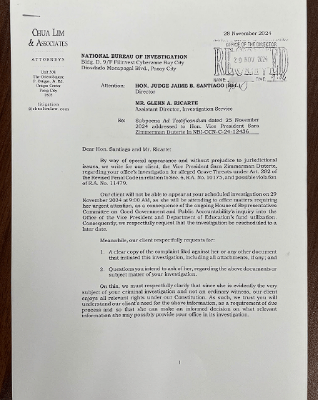 MANILA, Philippines – Along with her request for a resetting of her appearance before the National Bureau of Investigation, Vice President Sara Duterte also asked the NBI to furnish her a copy of the questions intended to be asked of her during the inquiry.