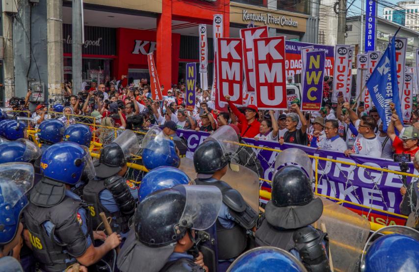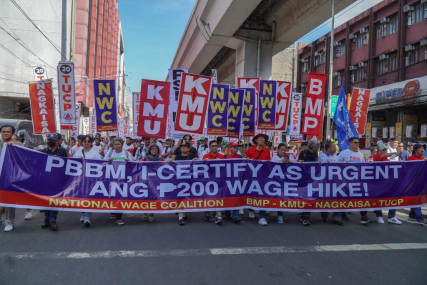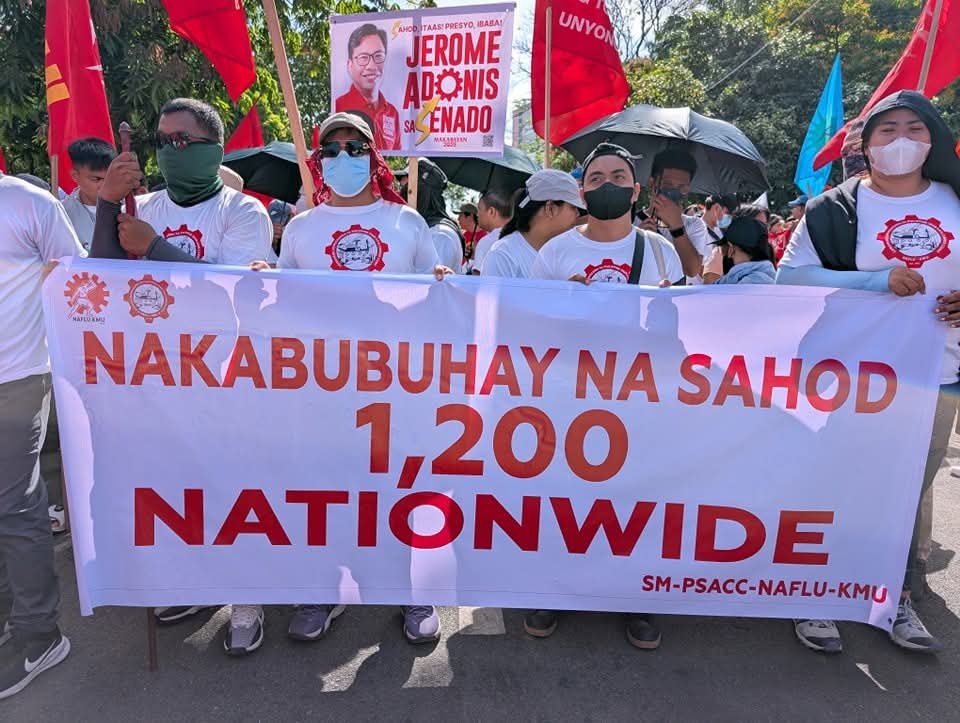 An estimated 5,000 workers joined the protest organized under the National Wage Coalition (NWC), calling on the government for a ₱200 daily wage increase, security of tenure, and the abolition of the contractualization scheme.