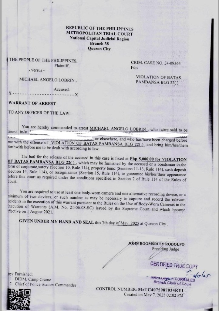 The warrant, dated May 7, 2025, was issued by Judge John Boom S. Sy Rodolfo of the Metropolitan Trial Court Branch 38.