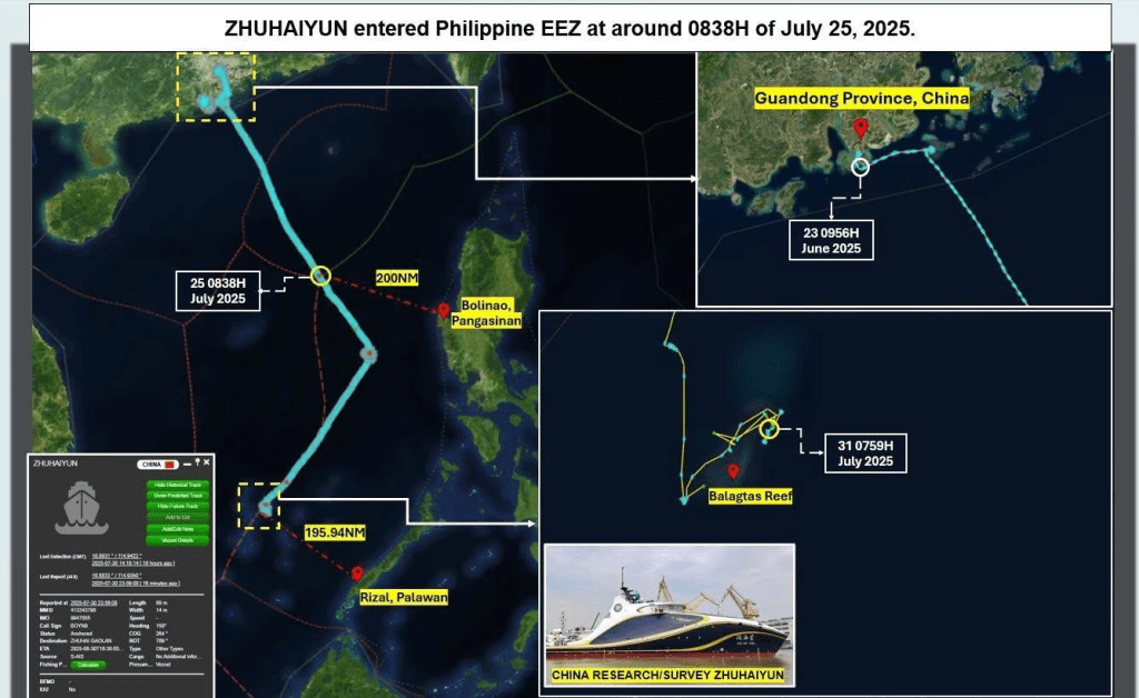The other two vessels, XIANG YANG HONG 10 and ZHUHAI YUN, left Guangdong on June 23, 2025, and entered the Philippine EEZ on June 25. They were first detected about 200 nautical miles off Bolinao, Pangasinan, and are currently operating 195 nautical miles off the coast of Rizal, Palawan, in what appears to be joint MSR activities near Balagtas Reef.