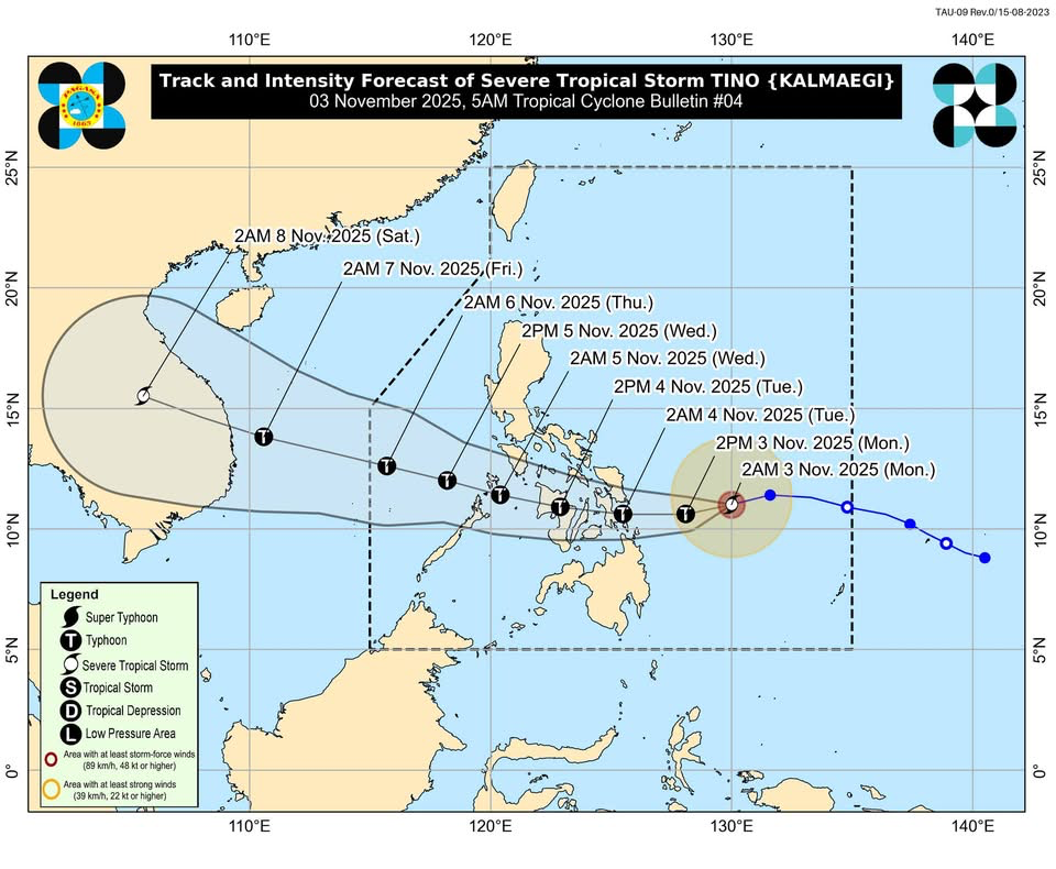 According to PAGASA’s Tropical Cyclone Bulletin issued at 2:00 PM, Tino is forecast to make landfall tonight or early Tuesday over southern Eastern Samar, Leyte, Southern Leyte, or Dinagat Islands, maintaining typhoon strength throughout its passage.