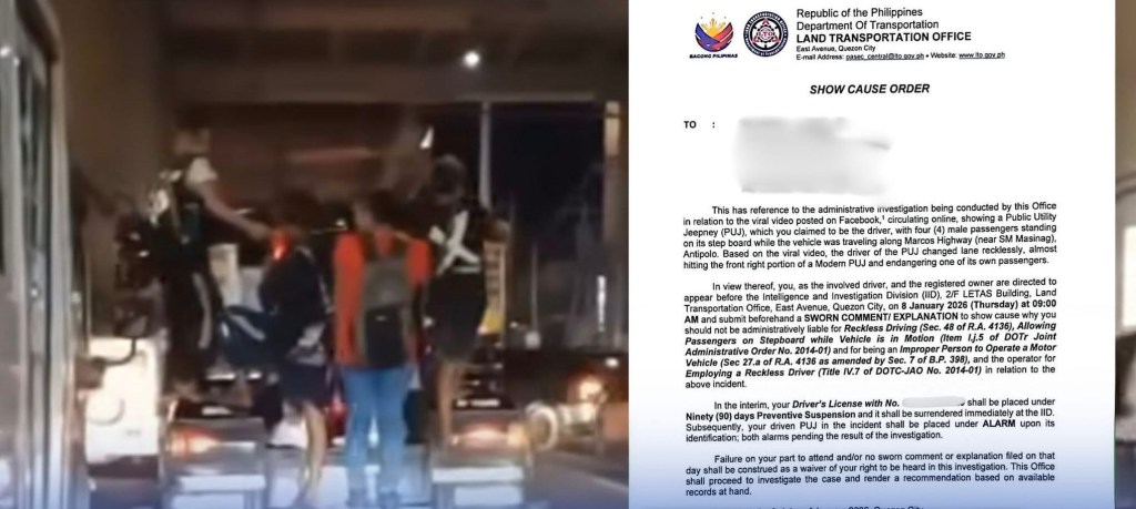 MANILA — The Land Transportation Office (LTO) has issued a Show Cause Order (SCO) against a Public Utility Jeepney (PUJ) driver in Antipolo City after a viral video showed passengers standing on the vehicle’s step board while it was in motion, the agency said.